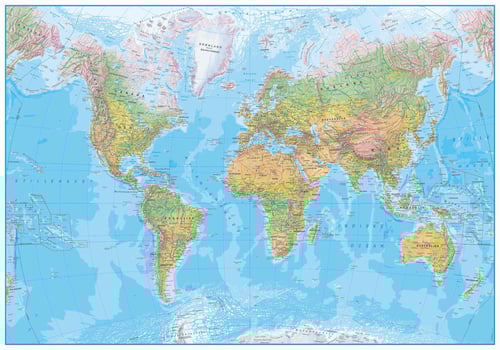 Et smukt klassisk verdenskort i stort format 70x100 cm, der passer til en normal plakatramme. Kortet, der er helt opdateret, er af typen fysisk verdenskort, hvor man kan se landenes og kontinenternes fysiske karakteristika med ørken, is, skov, slette, bjerge m.m.